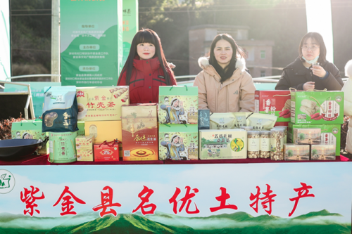 与紧张赛事相映成趣的,是位于主会场旁特色产业展示区的悠然茶香与热闹交易。在嶂拔村委会前的广场上,一场别开生面的“茶香市集”与赛事同步展开。赛事组委会紧密衔接“活动+”与产业推广思路,在活动现场专门设立了农特产品展销摊位。多个展销摊位前,紫金蝉茶、车前油茶、紫金蜜薯、绿壳鸡蛋、优质丝苗米等紫金特色农产品琳琅满目,供完赛选手、游客和村民随意试吃品尝。